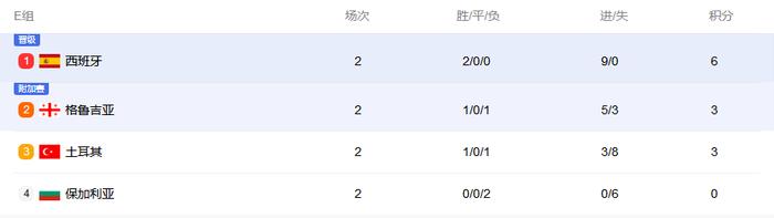 Trong nhóm E E, nơi Tây Ban Nha, Thổ Nhĩ Kỳ, Georgia và Bulgaria được đặt, Tây Ban Nha và Thổ Nhĩ Kỳ, giành chiến thắng trong vòng đầu tiên, là hai đội mạnh nhất trong sức mạnh tổng thể và cũng là đối thủ cạnh tranh trực tiếp của nhóm hàng đầu. Do đó, cuộc đối thoại trực tiếp giữa 6 điểm của hai bên sẽ xác định phần lớn quyền sở hữu của vị trí đầu tiên trong nhóm.