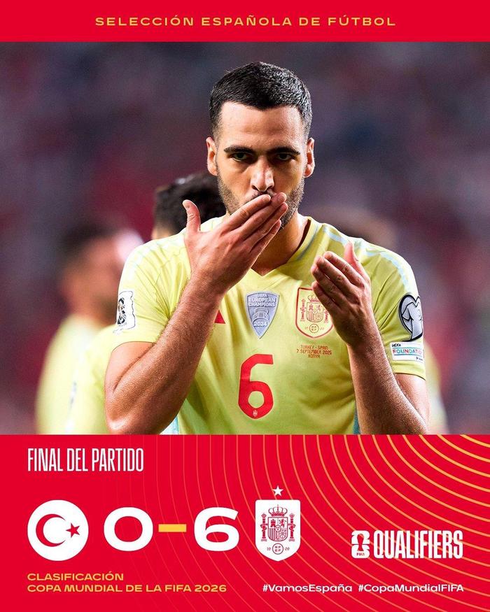 Vào sáng sớm ngày 8 tháng 9, vòng loại châu Âu cho Hoa Kỳ, Canada và Mexico World Cup tiếp tục. Nhóm E đã mở ra trò chơi Focus vào ngày trận đấu này, và Tây Ban Nha đã vội vã đến trận đấu với Türkiye. Merino, người chơi cho Arsenal trong trò chơi này, đã chơi hat-trick, Pedri ghi hai lần, Yamal hỗ trợ và ghi hai bàn, Ferran Torres ghi bàn, Barcelona Shone 3 Stars và Tây Ban Nha đánh bại đối thủ 6-0.