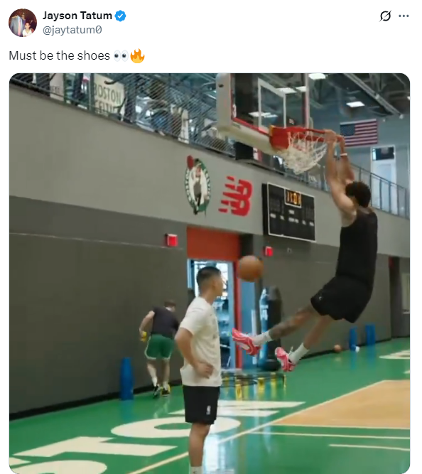 Tatum nhảy lên và lao xuống bằng cả hai tay, thò tay vào rổ và hét lên. Anh đăng video kèm chú thích: Chắc chắn là đôi giày.