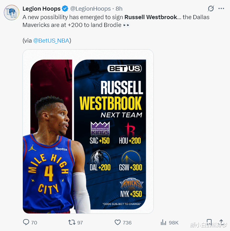 Bằng cách này, các vị Vua sẽ giành được một ghế để ký hợp đồng với Westbrook. Westbrook có thể ký mức lương cơ bản của cựu binh là 2,29 triệu USD. Đánh giá tỷ lệ cược trên sân nhà tiếp theo của Westbrook, Kings đứng thứ nhất, Rockets đứng thứ hai, Mavericks đứng thứ ba, Warriors đứng thứ tư và Knicks đứng thứ năm. Khả năng cao là anh ấy sẽ tới Sacramento.
